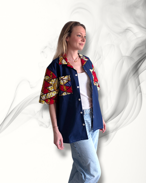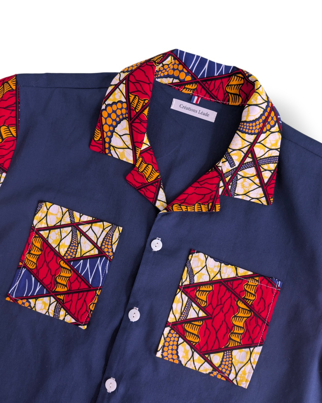 Chemise manches courtes confectionnée dans des chutes de coton bleu et de tissu wax*.
